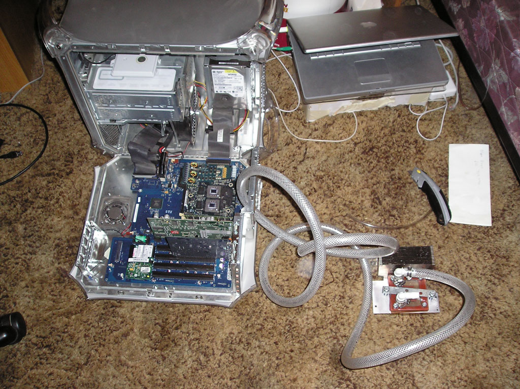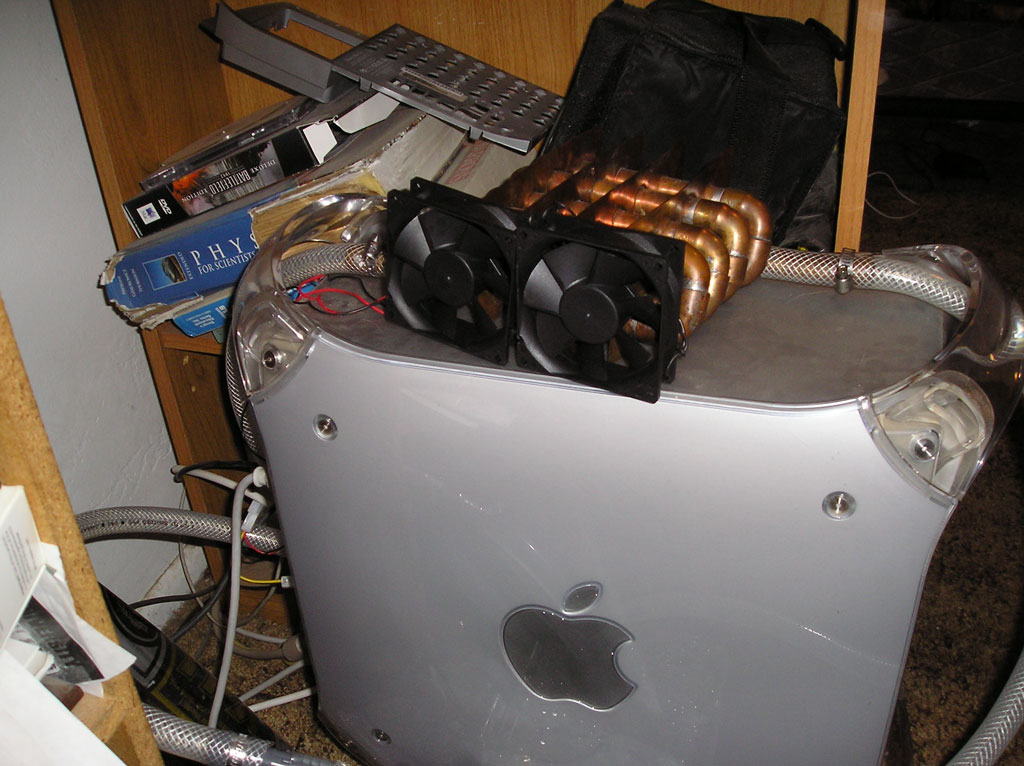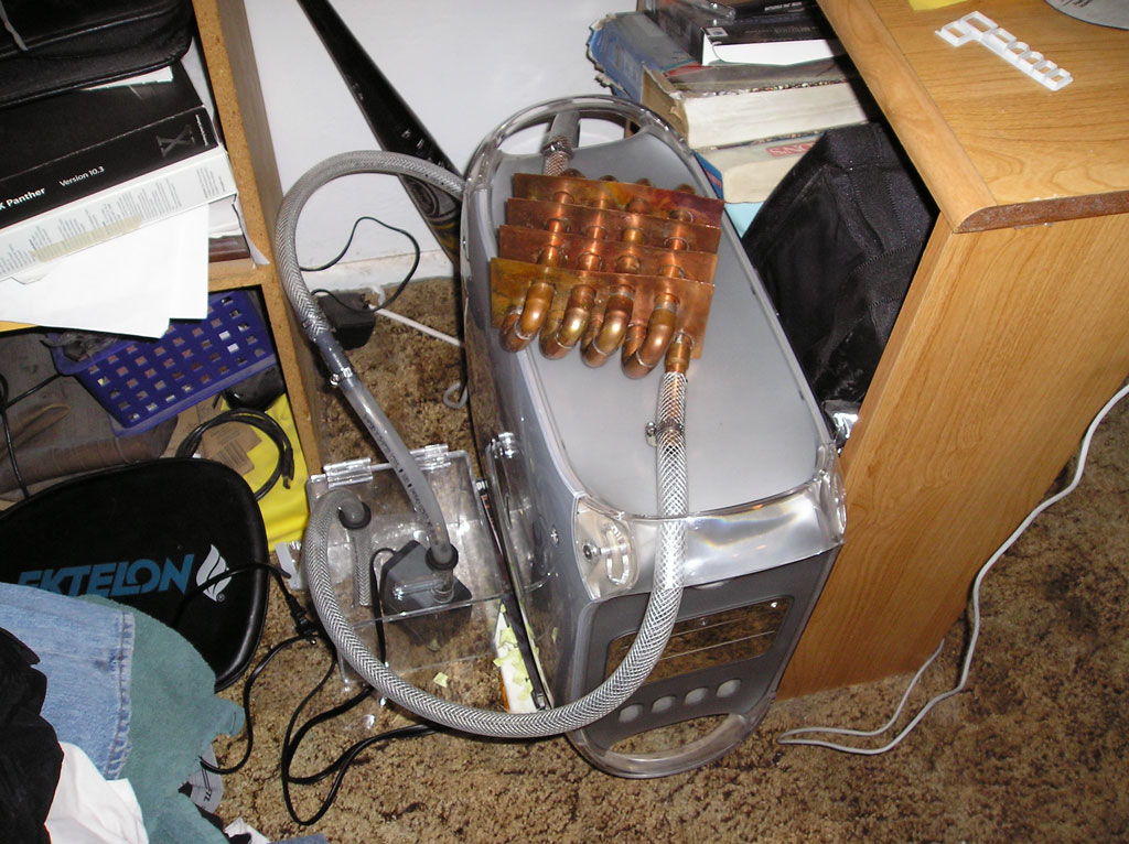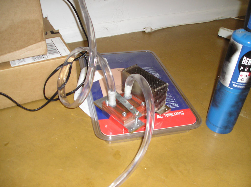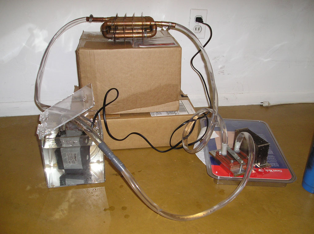 This is a final picture of what it looks like from the outside. Currently, I don't even have a fan for the radiator and it still took over 2 hours for the temp to stabalizer. This is partially due to the fact that I have about a gallon of water running through the system. The CPU temp seems to have stabalized around 130, which is down a little from where I was. With a fan or two on the radiator, that should drop another 5 degrees I would expect. |