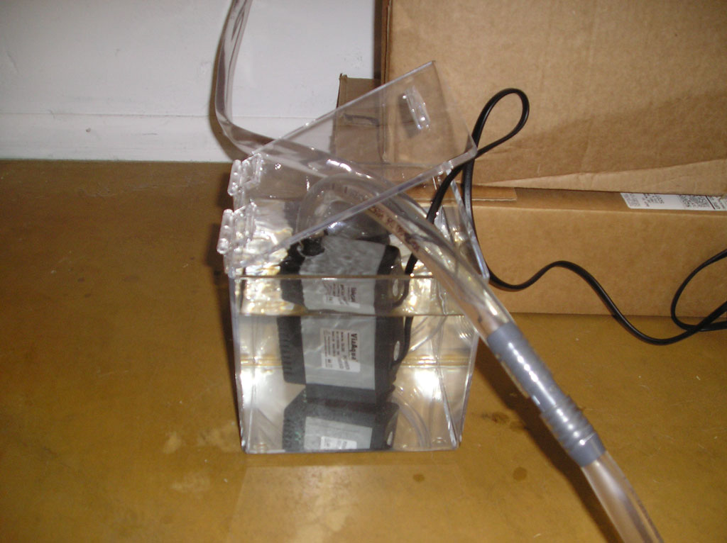 Entire systems checking for leaks. I let the system run like this for a week straight to see if any leaks would occur. One drop would fall from where the hose connected to the radiator, but was fixed with a thicker tubing to allow a tighter clamping force. |